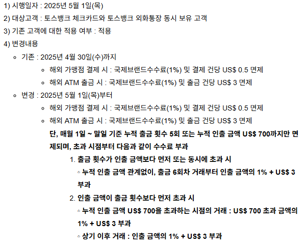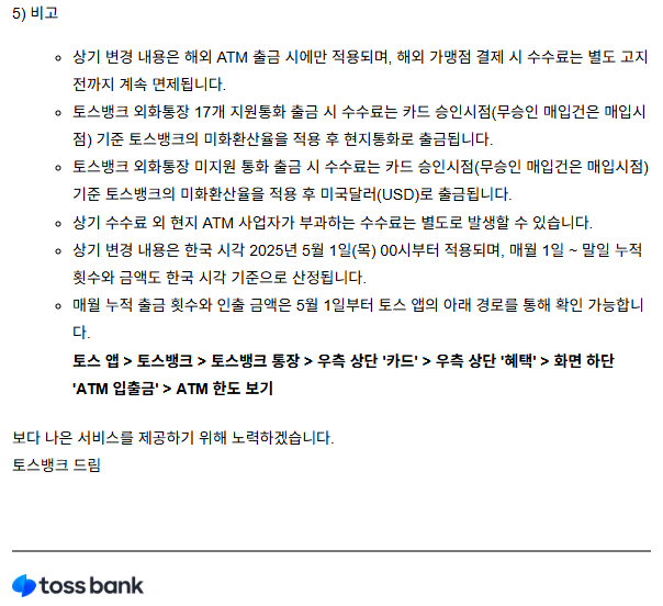 2025년 5월 1일 부로 해외 ATM 무료 출금이 월 5회, 누적 700$ 까지만 된다. 그 이후 부터는 수수료가 발생한다. 이 점 참고 바란다.